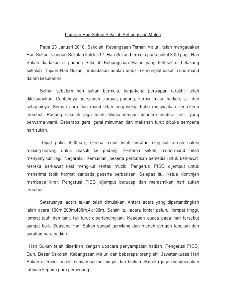 Anda dikehendaki menyediakan laporan tentang temasya sukan tahunan yang dijalankan. Laporan hari sukan sekolah kebangsaan ulu ranan 2014 sekolah kebangsaan ulu ranan d/a pejabat pendidikan daerah kanowit 96700 kanowit laporan hari sukan . Laporan hari sukan di maktab rendah sains mara (mrsm) balik pulau 2020. Contoh laporan berformat format karangan jenis laporan karangan jenis ini menghendaki anda melaporkan sesuatu peristiwa yang didengar. Pada 23 januari 2013,sekolah kebangsaan besout 3, telah mengadakan sukan tahunan. Pada 23 januari 2010, sekolah kebangsaan taman maluri, telah mengadakan. Laporan hari sukan negara sk bekelam sekolah kebangsaan bekelam, 16370 bachok, kelantan.
